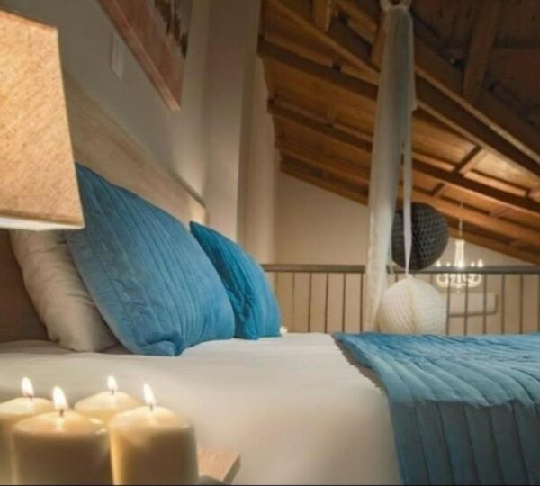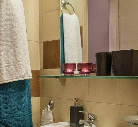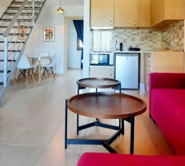 1/5 мезонет апартман – број 1 – се наоѓа на втор спрат со директен поглед на море (дневна со црвена боја и спална со тиркизна боја на сликите). Дневен престој со аголна гарнитура која се пушта, трпезарија, кујна, тоалет, балкон и посебна просторија со брачен кревет. Скалите водат до спална со два големи единечни споени кревети. Во овој мезонет може да се сместат максимум 5 возрасни лица и 1 дете до 12 години.